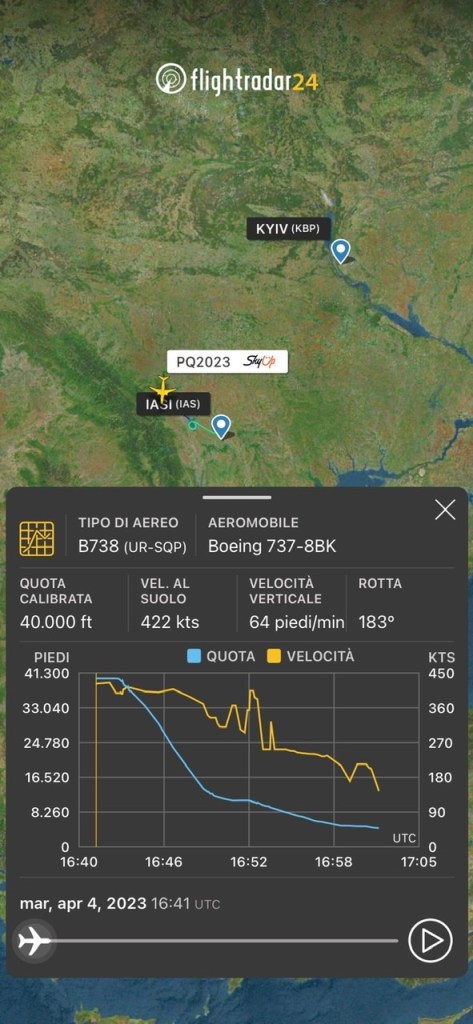 Il velivolo, un Boeing 737/800 UR-SQP e’ decollato alle 19:15 di martedì scorso da Kiev Boryspol come PQ2023 e dopo 52 minuti di volo e’ atterrato a Iasi.