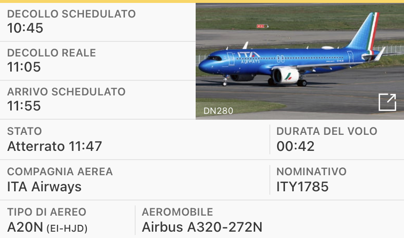 Il quarto Airbus 320neo di ITA Airways con le marche EI-HJD ha iniziato a volare il 12 aprile 2023 con una tratta tra Roma Fiumicino e Milano Linate come ITY/AZ2016.