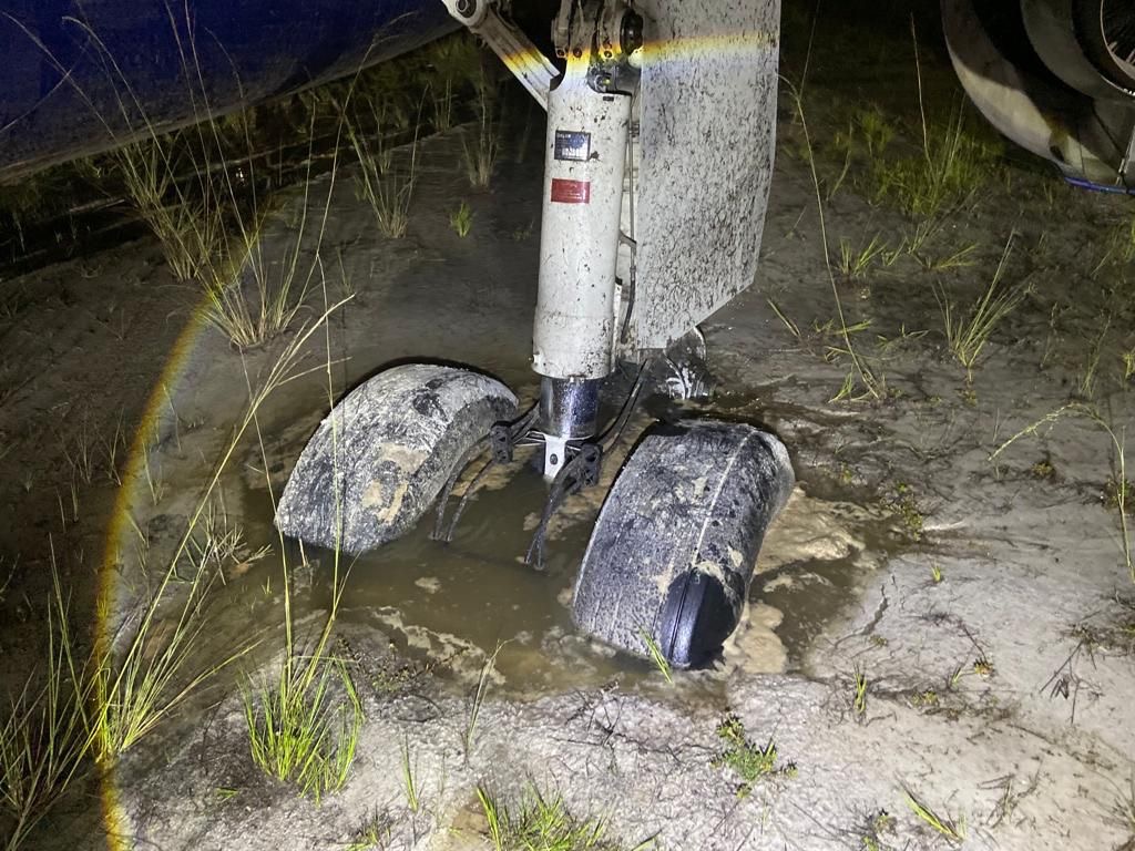 In quest’immagine posta sopra si vede il carrello principale sinistro per oltre metà’ dell’assurdo cerchio e pneumatici impantanato nella melma del terreno reso così dalle piogge.
