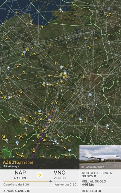L’A320-216 EI-DTK in servizio con ITA Airways e di proprietà di un lèssor sta completando ora il volo Napoli – Vilnius come AZ8016.