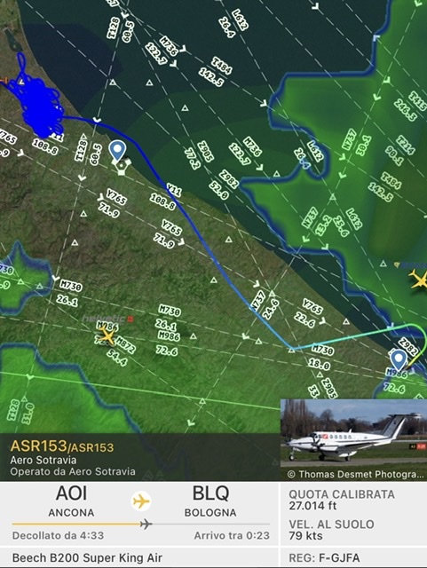 E’ in corso il Giro d’Italia e c’è’ sempre un aereo che rilancia le immagini per essere poi trasmesse in Tempo reale nelle dirette. E’ un Beech 200 equipaggiato con le apparecchiature elettroniche necessarie a questo compito. Il velivolo ha le marche F-GJFA e appartiene alla Aero Sotravia. Oggi sarà in volo per cinque ore, e’ decollato alle 12:11 e attualmente e’ sulla Romagna a FL270.