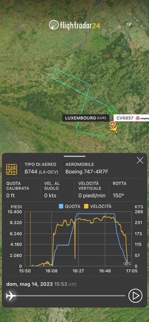 L’aereo e’ ritornato a Lussemburgo con il peso oltre i limiti per l’atterraggio, MLW – maximum landing weight. L’aereo non e’ riuscito a effettuare la retrazione dei carrelli di atterramento e quindi ha effettuato uno scarico di carburante in volo. L’aereo e’ stato in volo poco meno di un’ora.