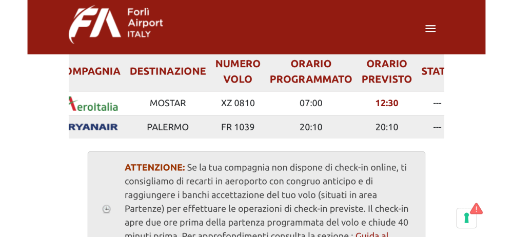 Dopo le 11 ore e 7 minuti di ritardo nella giornata di ieri sulla Forli – Catania. Invece il volo per Oradea e’ decollato spaccando il secondo alle 12:30. Oggi il volo GoTo-Fly.it per Mostar e’ previsto alle 12:30 , anziché alle 7 come riporta la sezione voli in tempo reale del gestore F.A. srl che gestisce l’aeroporto di Forlì.
