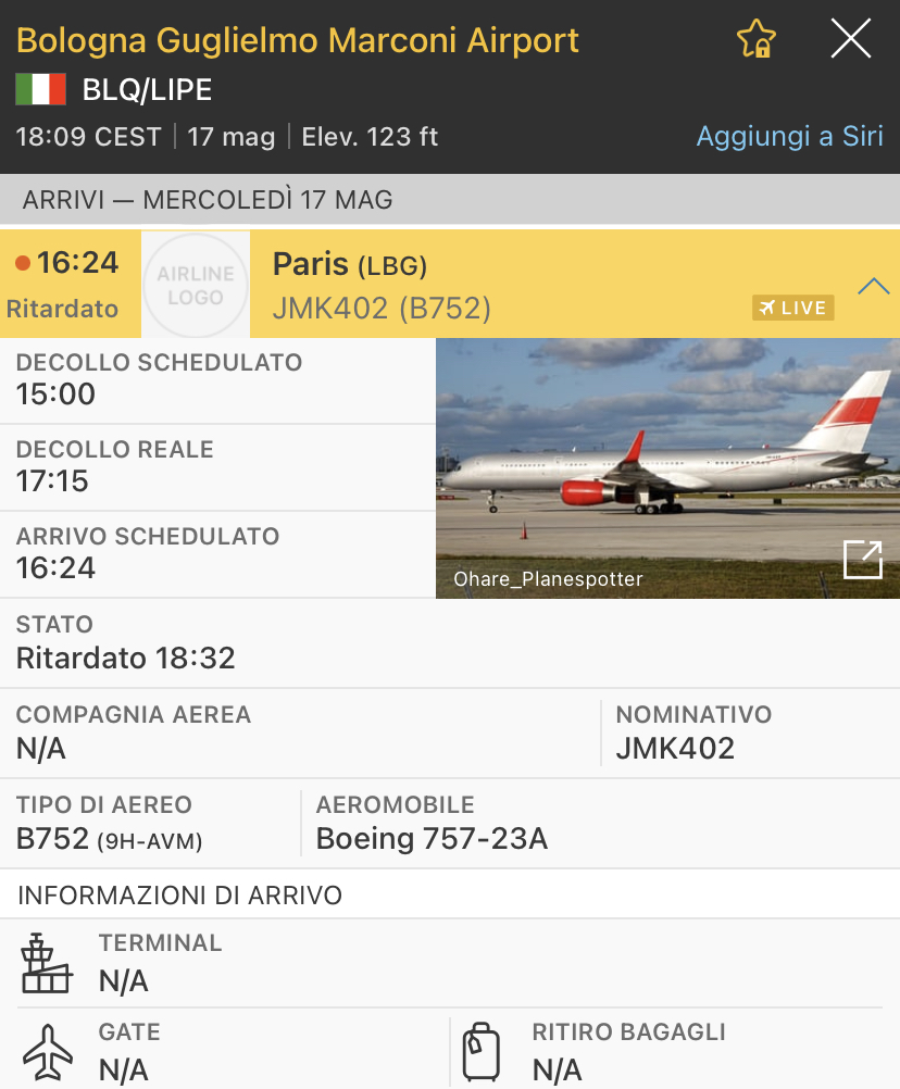 L’aereo e’ in arrivo da Parigi Le Bourget, l’aeroporto parigino utilizzato dagli executive jet.