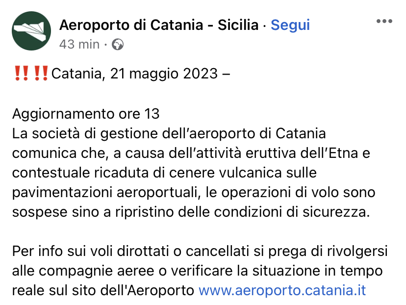 Poco dopo le 13 la SAC che gestisce l’aeroporto di Catania ha scritto sui social che le operazioni aeroportuali sono sospese per l’eruzione dell’Etna in atto da oggi.