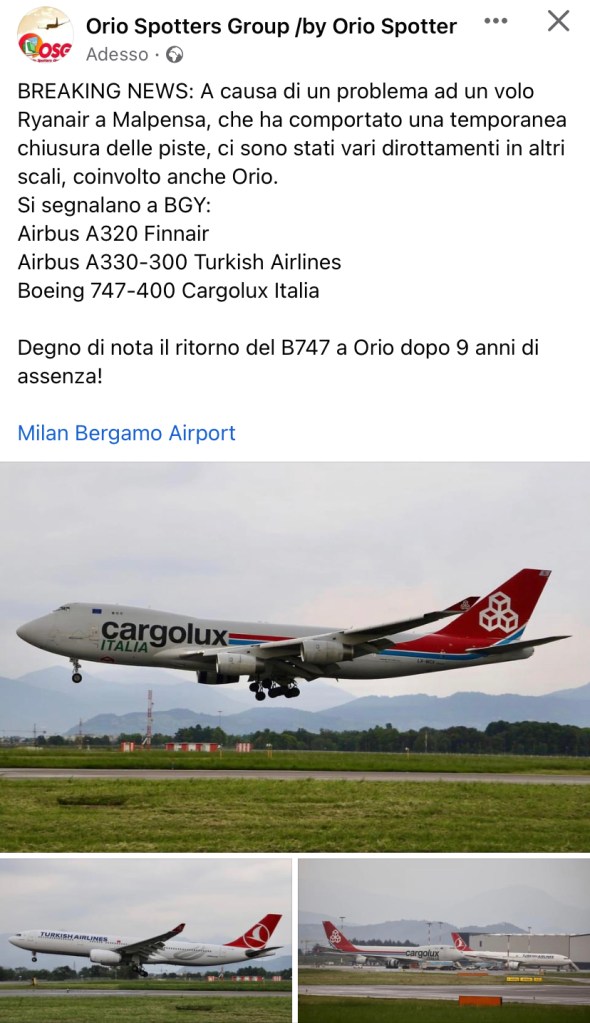Qui ci sono le foto pubblicate sulla pagina Facebook di Orio Spotters Group del B747/400F di Cargolux Italia da Lussemburgo e dell’A330-300 Turkish Airlines da Istanbul. Questi due aerei e un A321 Finnair sono atterrati a Bergamo a causa della temporanea chiusura delle piste dello scalo di Milano Malpensa per l’atterraggio fuori programma del Milano Malpensa – Barcellona di Ryanair che ha avuto un problema tecnico.