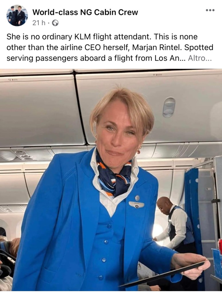 E’ Marjan Rintel – Presidente e CEO di KLM , che da un annetto ha preso il posto di Pieter Elbers, la sua intenzione nell’essere a bordo di un aereo della compagnia aerea olandese che dirige e’ capire i carichi di lavoro che e’ sottoposto il personale.