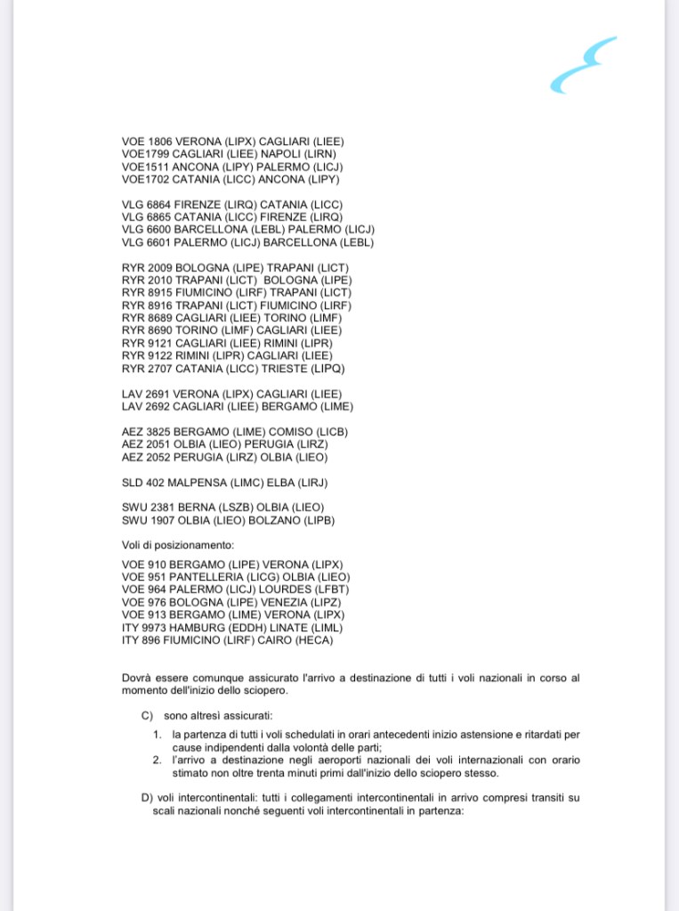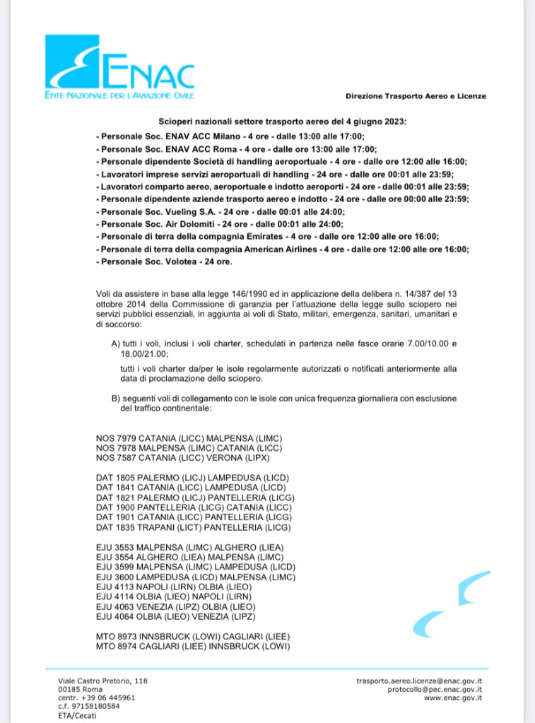 11 astensioni dal lavoro sono previste per il prossimo 4 giugno da controllori di volo, operatori del comparto dell’handling, indotto e diverse compagnie aeree come Air Dolomiti, Volotea e Vueling per 24 ore. Poi Emirates personale di terra dalle 12 alle 16 e personale American Airlines.