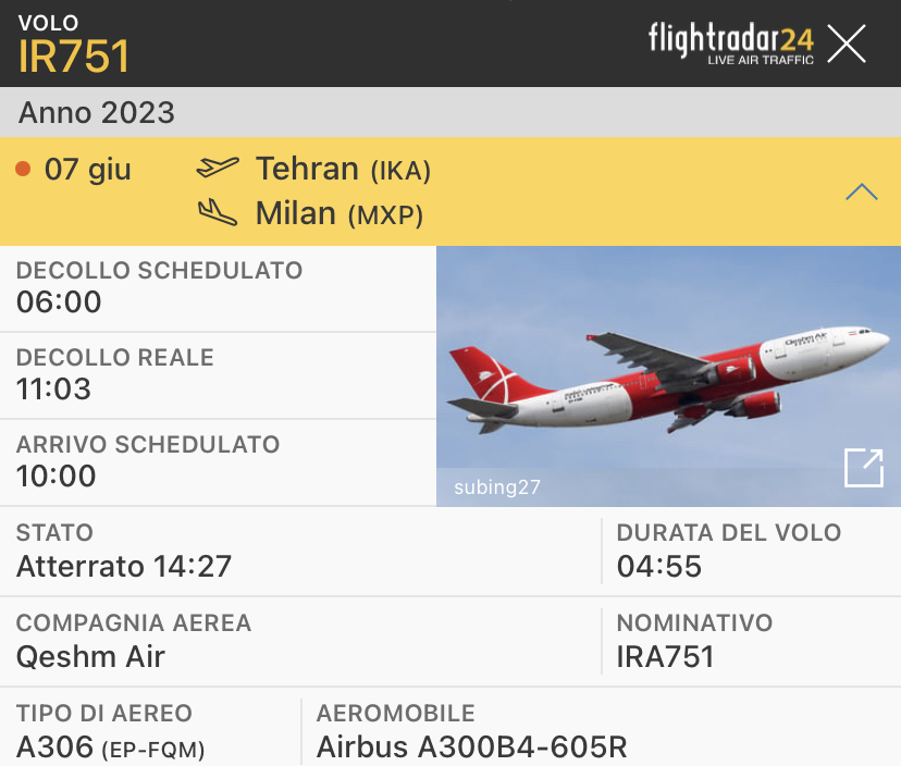 Nella giornata di ieri il volo Teheran – Milano Malpensa della Iran Air non e’ stato operato dal classico Airbus 330-200 del vettore di bandiera, ma e’ stato sostituito da un aereo della compagnia iraniana Qeshm Air giunto con quasi 4 ore e mezza di ritardo.