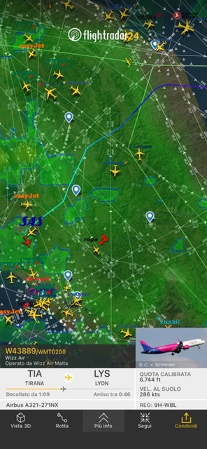Alle 11:29 UTC Ha inserito 7700 un A321neo della Wizz Air quando era in volo sulle Marche nel suo normale collegamento tra Tirana e Lione.