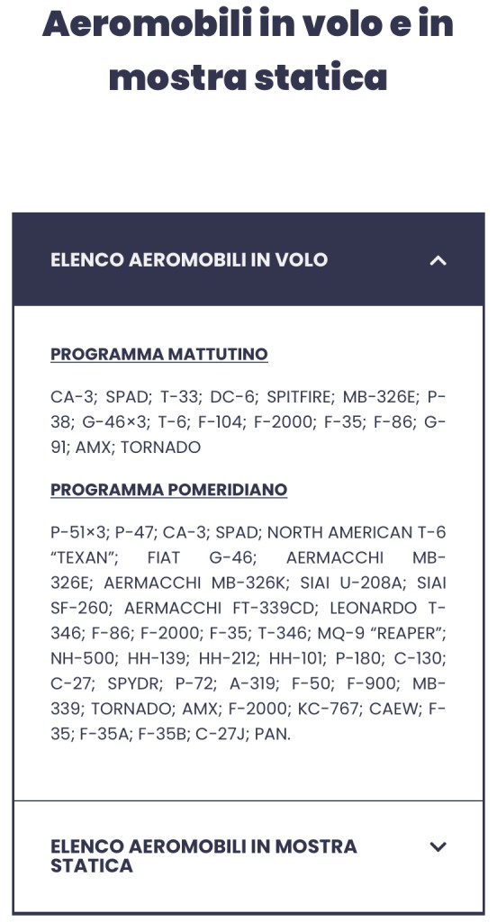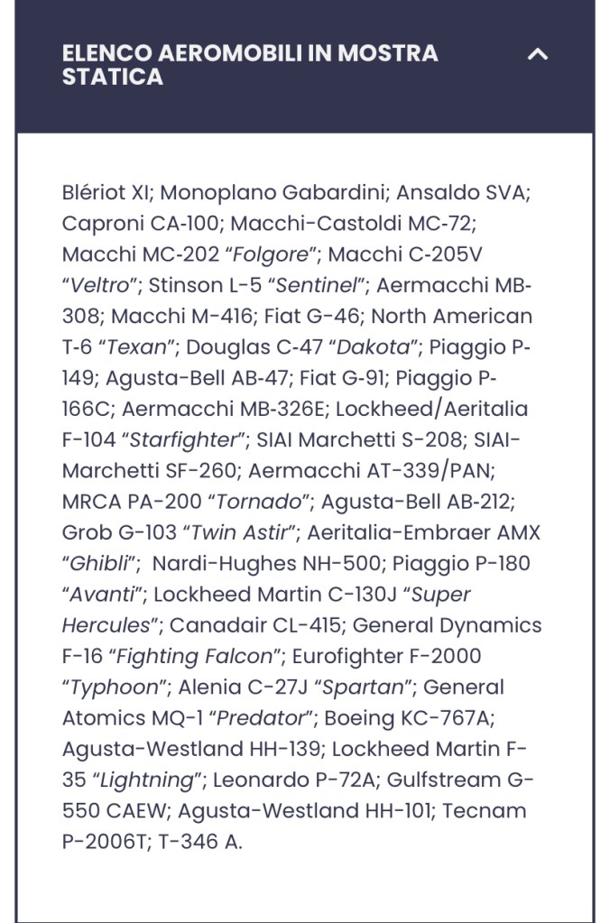 Questo e’ l’elenco degli aerei che voleranno durante la manifestazione