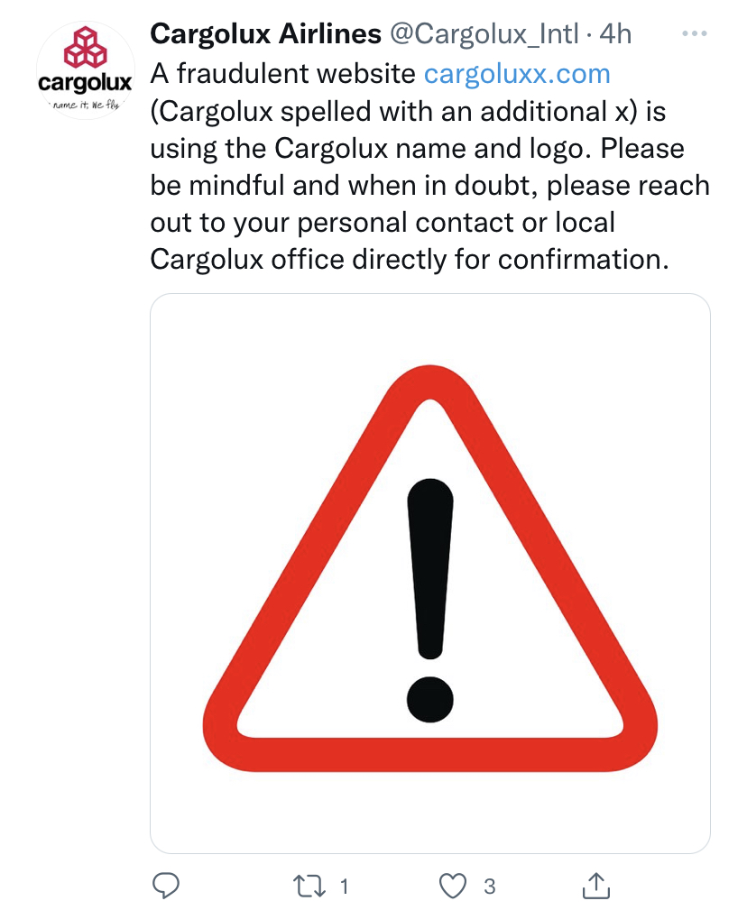Questa e’ la comunicazione su Twitter del vettore lussemburghese Cargolux , che comunica la presenza di un sito definito fraudolento, il quale ha una “x” in più nell’indirizzo rispetto a quello ufficiale.