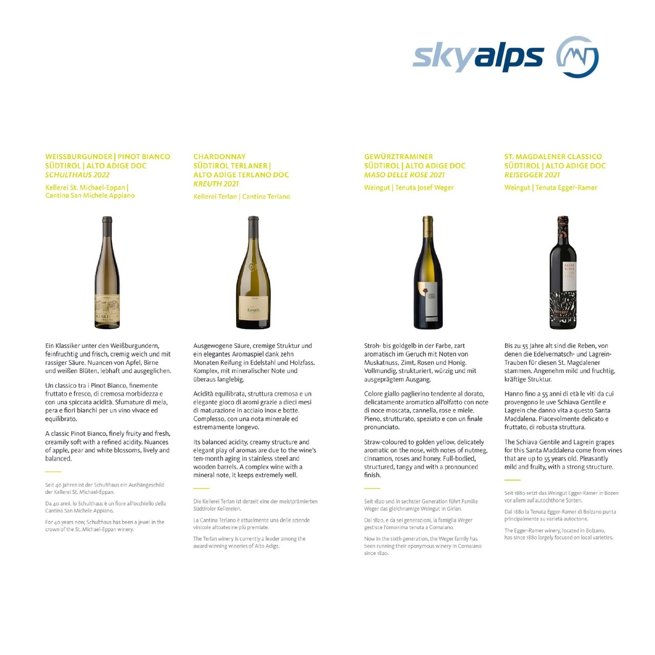 La produzione vinicola altoatesina viene sfoggiata bordo degli aerei della SkyAlps , la compagnia aerea capitanata da Josef Gostner e che da poco più’ di due anni ha iniziato a operare da Bolzano.