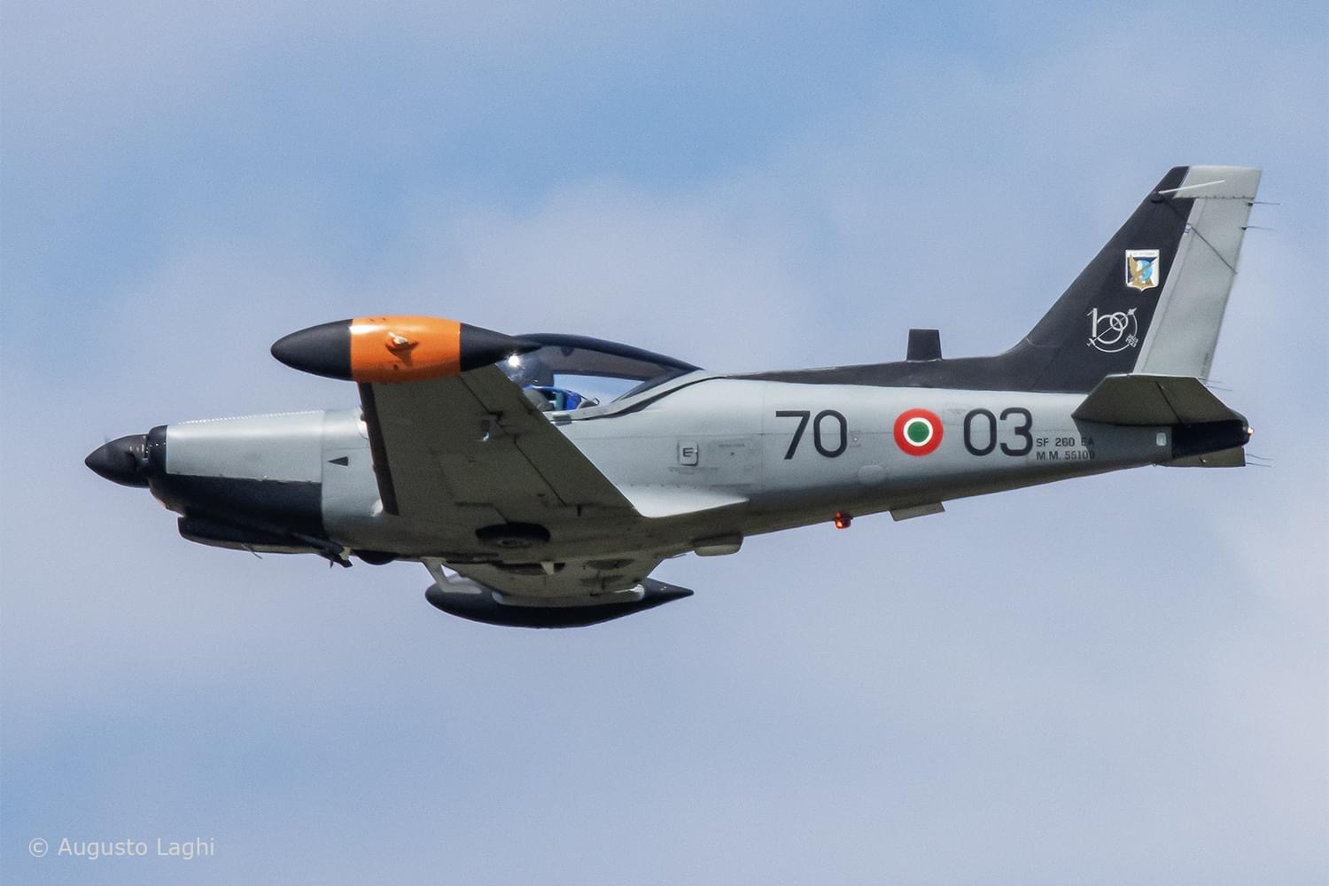 Un’altro aereo in servizio e’ questo SIAI SF260EA, lo sviluppo del SF260 a pistoni. L’Aeronautica Militare adotto’ per un periodo anche la versione turboprop. La versione EA acquistata in 30 aerei e’ quella che espleta tutt’oggi la formazione iniziale dei piloti militari. Fortemente apprezzato come tipo di aereo per le sue caratteristiche e prestazioni. Un prodotto di un’altra matita eccellente l’ing. Stelio Frati.