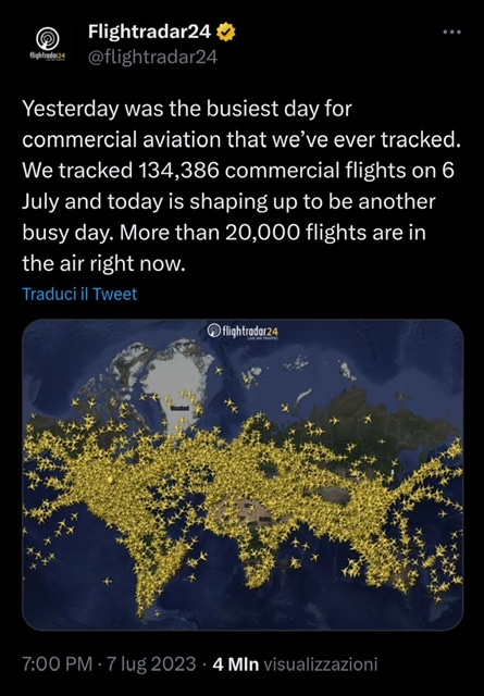 Il traffico aereo va molto bene e Flightradar24 ci notizia che il giorno 6 luglio la sua piattaforma di rilevazione di velivoli in volo ne ha registrato oltre 134mila.