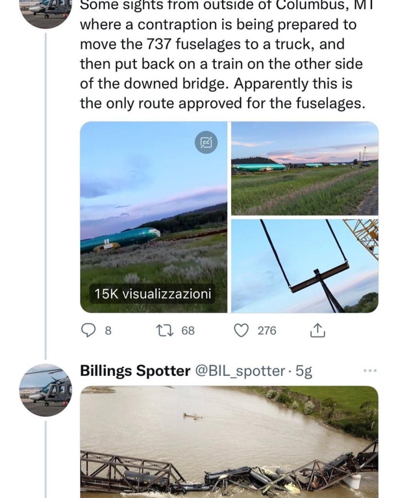 Il 24 giugno scorso un ponte sullo Yellowstone River nello stato del Montana a 40 miglia a ovest di Billings e’ crollato e da allora il viaggio si allunga nei tempi perché le fusoliere debbono essere scaricate dal treno, poi dopo un percorso su strada che varca il fiume vengono rimesse sul treno.