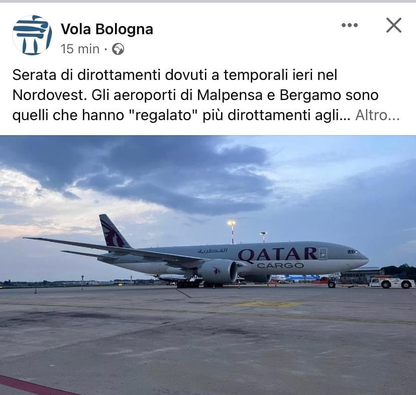Dopo il B747F Cargolux Italia arrivato a Genova, qui nel report di VolaBologna sui dirottamenti arrivati allo scalo Emiliano da Bergamo e Milano Malpensa per causa di meteo avverso c’è’ anche la foto di un Boeing 777F della Qatar Airways Cargo in sosta a Bologna.