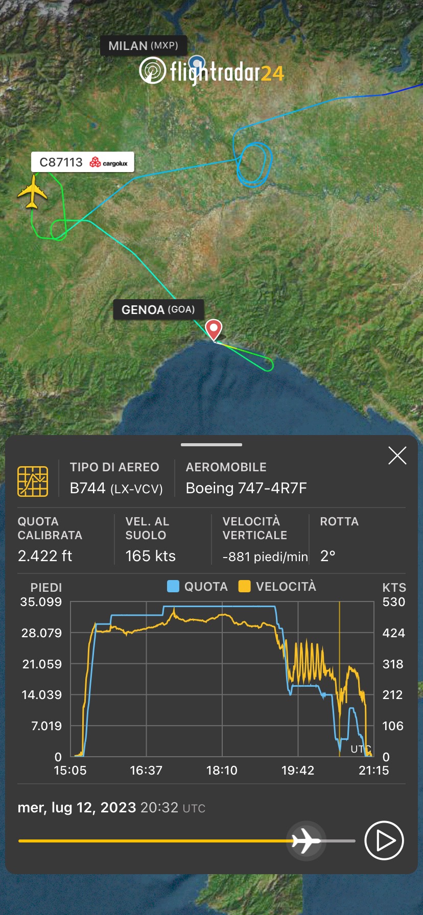 L’aereo della compagnia aerea cargo italiana quando ha visto la situazione meteorologica che nell’area di Malpensa riportava un cocktail di temporali, pioggia e grandine per non compromettere l’aereo nel ricevere danni di non poco conto si e’ diretto prima a sud di Milano dove ha effettuato attese per 40 minuti e un tentativo di atterraggio a Torino. Quindi segnalando priorità di essere a corto di carburante e’ atterrato a Genova.