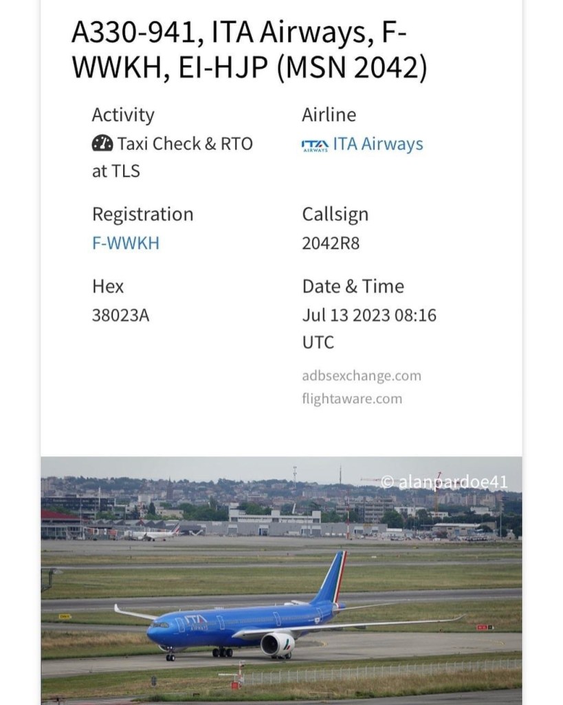 E’ ciò che ha fatto giovedì scorso 13 luglio il quarto Airbus 330-900neo per ITA Airways. Nella scheda tratta dal sito http://www.aviation.Flights.com, l’ex aibfamily , c’è’ anche l’immagine dell’aereo prima del RTO durante il taxi check.