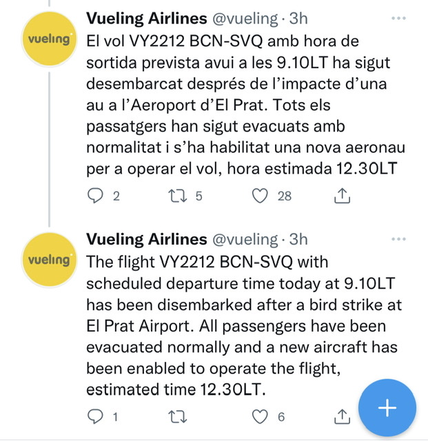 Quest’oggi il volo Vueling da Barcellona per Siviglia VY2212 operato con A320 con marche EC-JTR aveva iniziato la corsa di decollo FAA pista 25L, ma a un certo punto ha subito un bird strike e il pilota ha interrotto la fase di accelerazione per l’involo. Questa azione ha comportato che l’aereo si e’ creato in pista con almeno tre pneumatici afflosciati facenti parte di quei 4 appartenerti ai due carrelli principali. Oltre a quelli del carrello anteriore come riferiscono le fonti di stampa.
