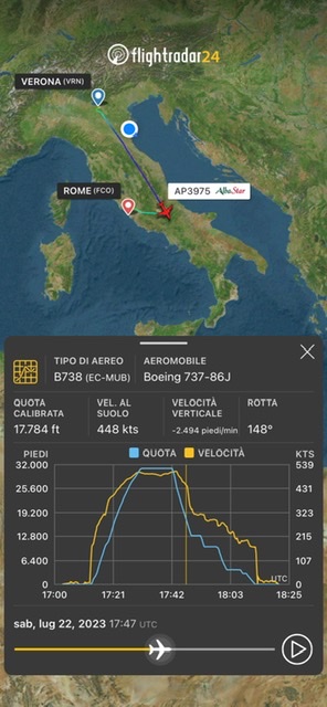 L’aereo, un B737/800 con marche EC-MUB, sul centro Italia dalla quota di FL310 e’ sceso a FL140 tra le 20:42Z e le 20:48Z. In sei minuti ha perso 17000 piedi, sembra per un problema di pressurizzazione , tra l’altro pare siano state fatte scendere le mascherine di emergenza. Durante la discesa il velivolo e’ comparso il codice 7700 sul transponder. Così come si vede dall’immagine.