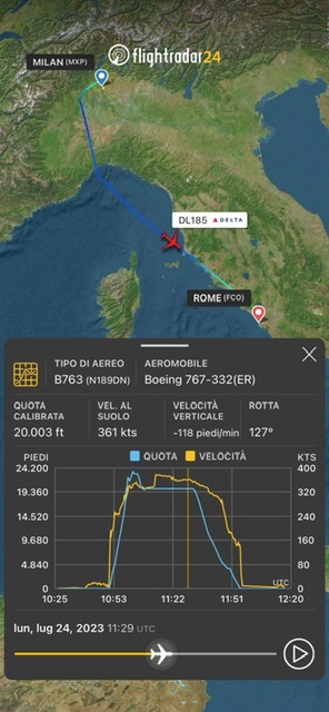 Il velivolo interessato e’ un Boeing 767-332ER N189DN che in decollo da Milano Malpensa ha raggiunto il livello di volo FL232, a poco più di FL200 ha invertito la rotta verso Roma Fiumicino, e’ chiaro Che presumibilmente l’aereo ha subito il fenomeno meteorologico avverso è distruttivo nella salita dopo il decollo per pista 35R.