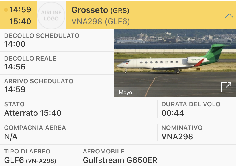 Questo aereo executive Gulfstream G650ER VN-A298 e’ atterrato a Grosseto proveniente da Hanoi. Il volo e’ durato 10 ore e 54 minuti.