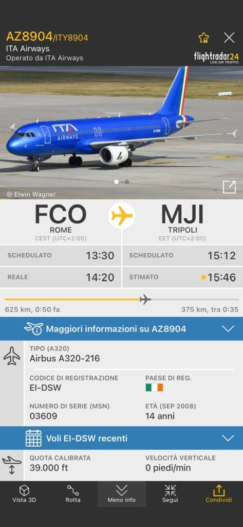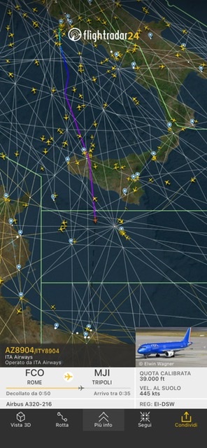 E’ tanto tempo che non si vedeva un aereo italiano di linea tra Roma e Tripoli. Esattamente oltre 10 anni. Quest’oggi e’ decollato un A320-216 EI-DSW ora in volo verso la Libia un po’ prima di Lampedusa.