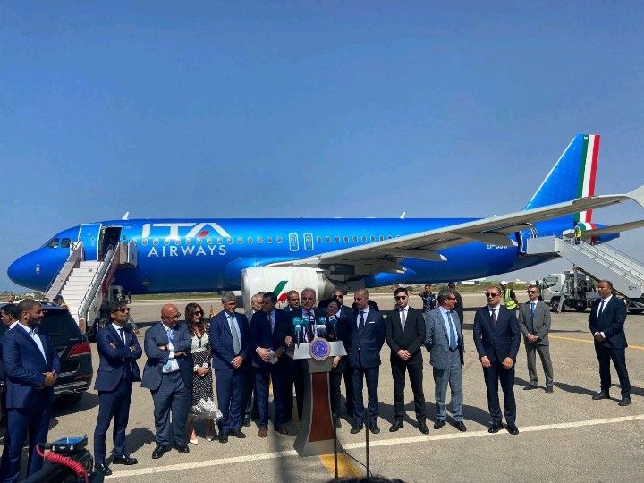 Nella foto c’è’ il momento ufficiale dell’arrivo nuovamente a Tripoli di un aereo italiano dopo oltre 10 anni, che i collegamenti non venivano più operati.