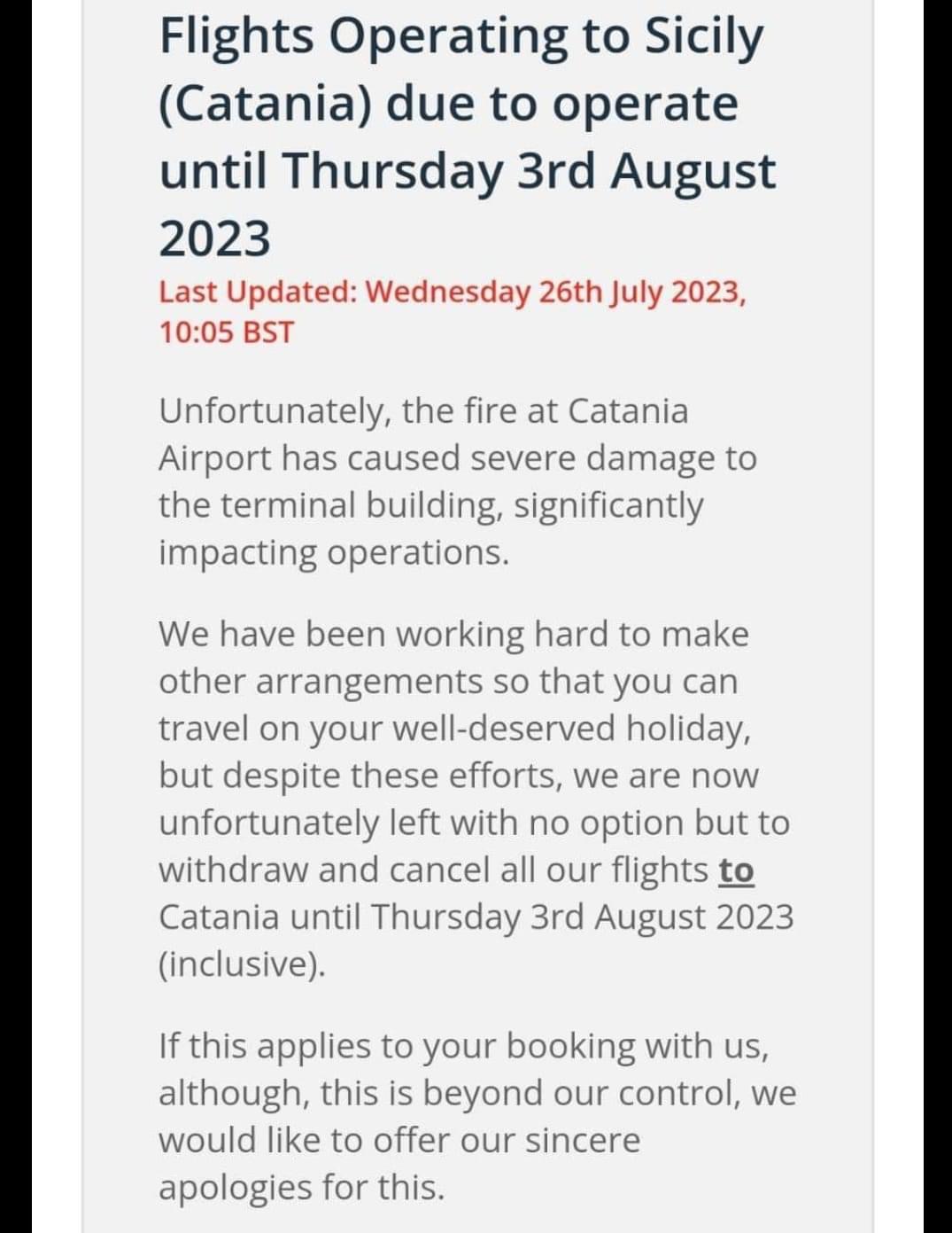 Questa e’ la comunicazione ufficiale della Jet2.com, che Sicilia in Volo ha ripreso circa i voli temporaneamente sospesi dai gateways inglesi per Catania a causa dell’incendio al terminal A e alle problematiche insorte successivamente con l’impossibilità di operare sull’aeroporto etneo.