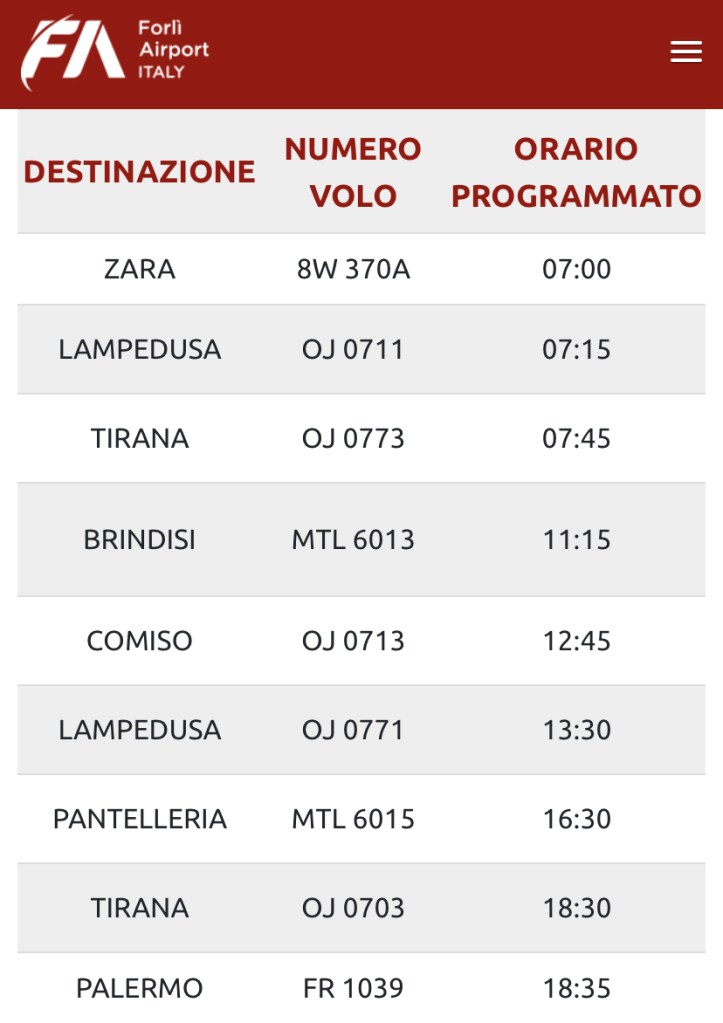 Quest’oggi Go To Travel / Go To Fly impiega tre aerolinee per effettuare i voli da Forlì. I vettori sono NyxAir con Saab 340 e ATR42/500, Raf-Avia con Saab 340 e Private Wings con Dornier 328/100.