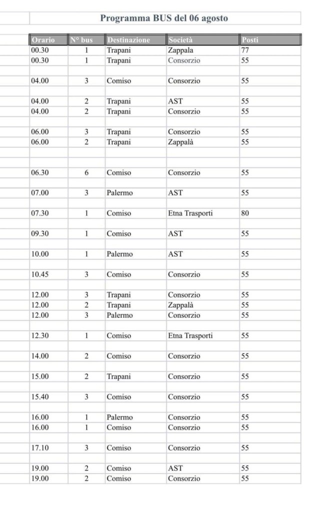 La società di gestione dell’aeroporto di Catania ha pubblicato la lista dei bus in partenza per gli aeroporti siciliani di Comiso, Palermo e Trapani.