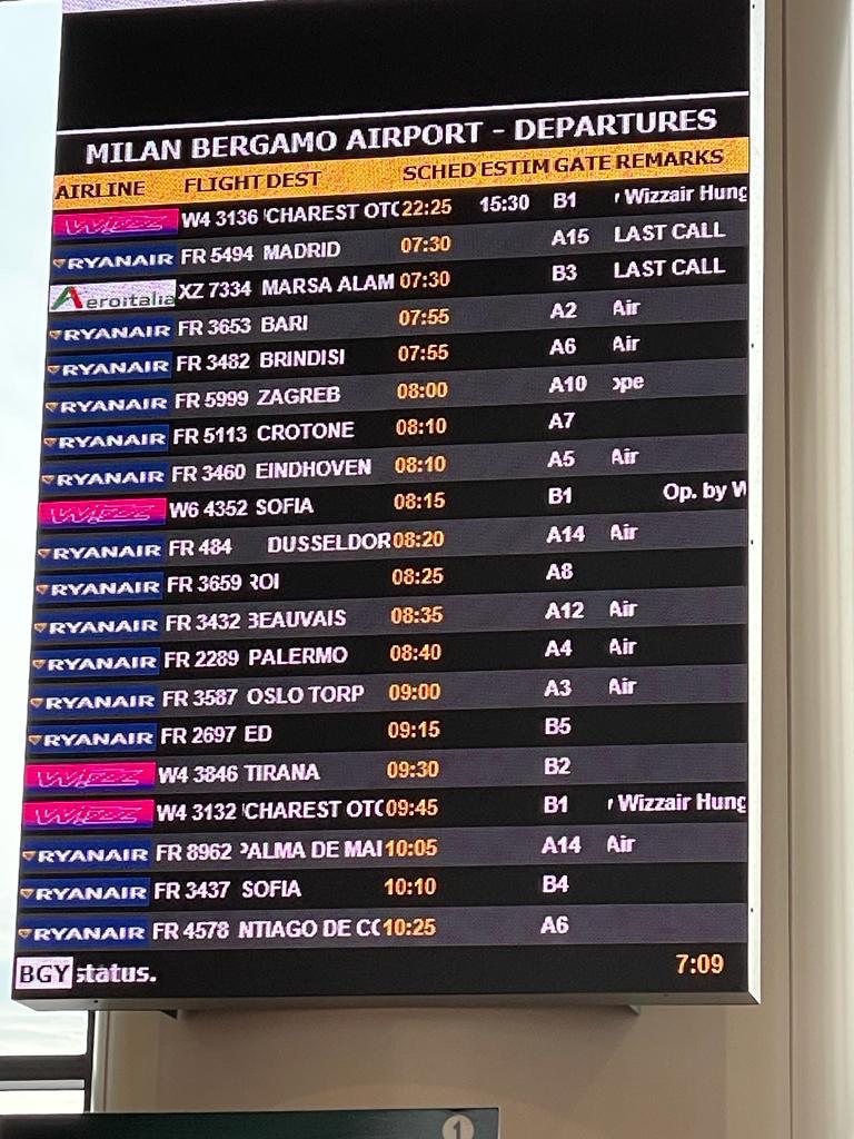 I passeggeri del volo di ieri sera della Wizz Air W43136 da Bergamo a Bucarest sono stati ritardati come orario di partenza dalle 22:25 di ieri sera alle 15:30 di oggi.