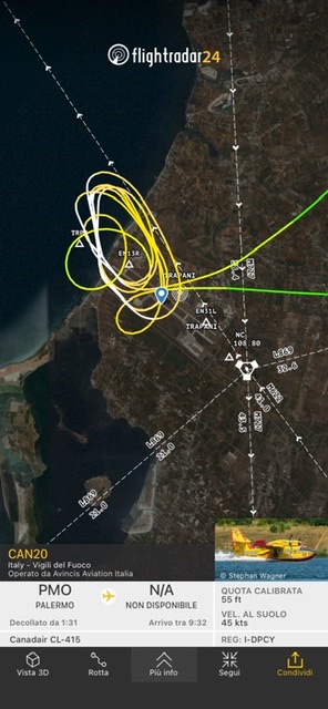 Come si vede dai segmenti nell’immagine, anche un Canadair CL-415 dei Vigili del Fuoco operato da Avincis e’ stato impiegato per diversi sganci d’acqua sull’aeroporto di Trapani , liquidi prelevati dal mare con ripetuti ammaraggi.