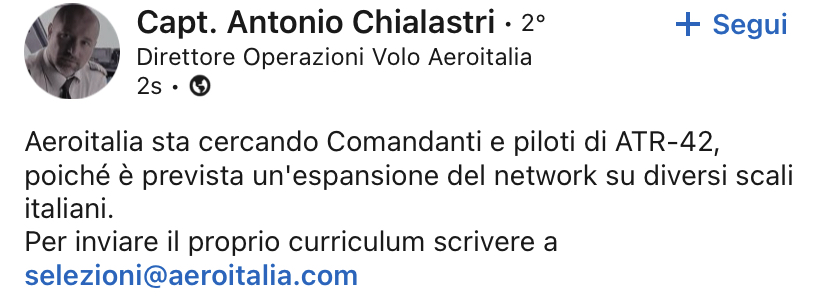 Recentemente la compagnia aerea sta cercando piloti, sia Comandanti che primi ufficiali per le attivita’ regionali del prossimo futuro con ATR42, non era un proprio annuncio, ma era il DOV Com.te Chialastri ad aver pubblicato la ricerca di personale, indicando di inviare il curriculum sempre a : selezioni@aeroitalia.com