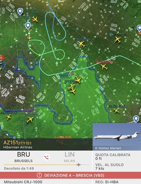 Un volo diretto a Milano Linate, la AZ151 operata da Hibernian Airlines con CRJ1000 EI-HBA dopo qualche slalom ha deciso di atterrare a Brescia, ritenuto piu’ sicuro.