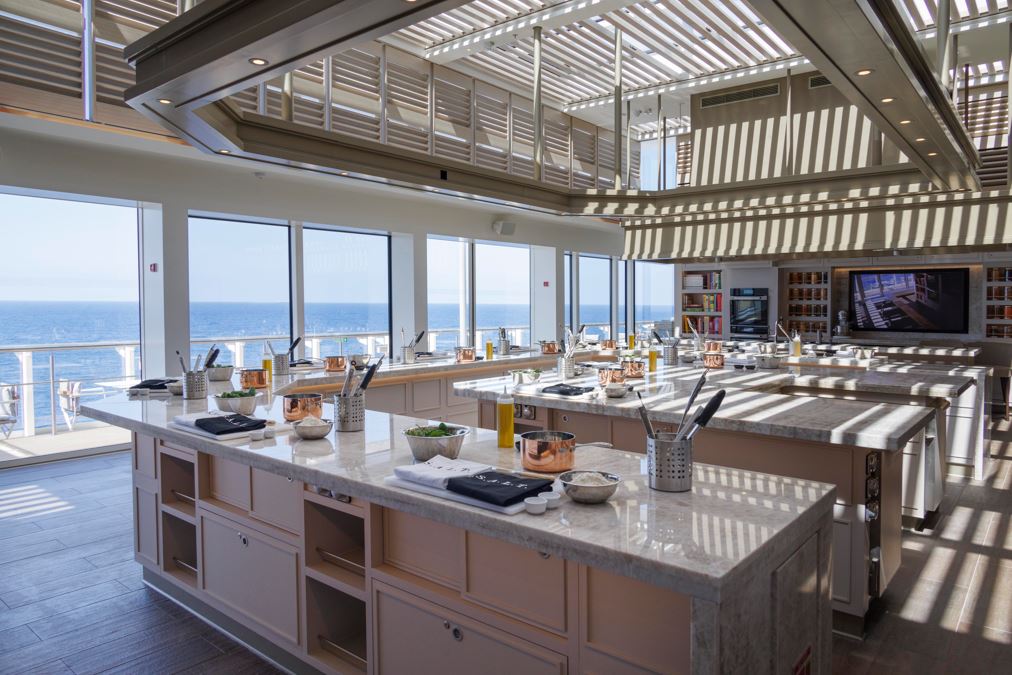 La scuola di cucina non è stata solo ampliata per ospitare fino a 22 partecipanti; è stata spostata nell’ambientazione più spettacolare che si possa immaginare. Sul ponte 10, con un’intera parete di vetro, i corsi di cucina della durata di un’ora sono tra le attività più popolari a bordo della nave. Alla