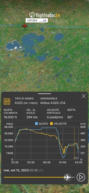 L’aereo e’ decollato alle 01:14 locali di oggi e l’atterraggio e’ avvenuto alle prime ore del giorno, alle 6:26 ha inserito il 7700 sul transponder e ha toccato terra presumibilmente alle 6:45.