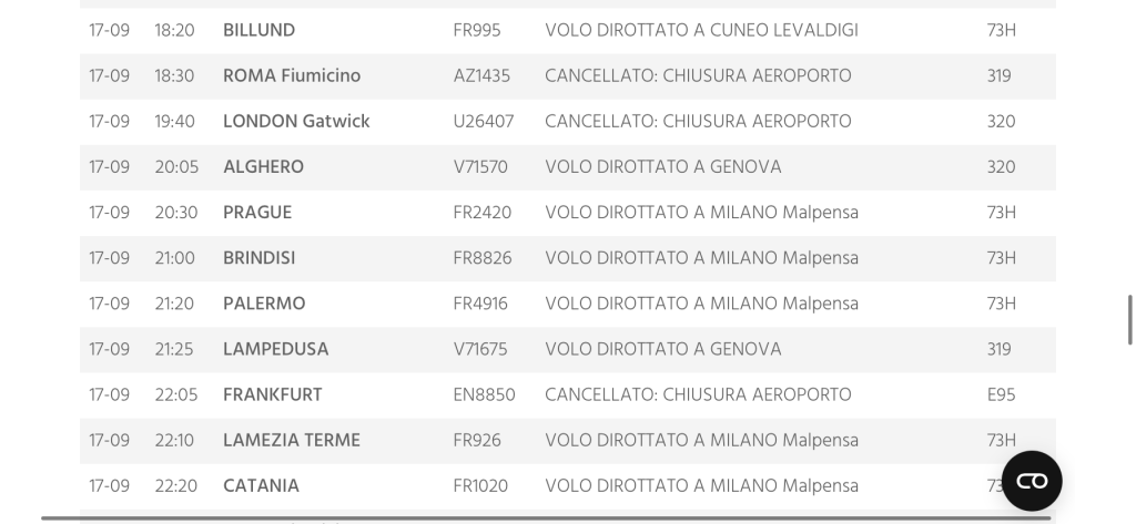I voli Ryanair operanti sono attestati a Cuneo e Milano Malpensa. Wizz Air a Milano Malpensa, Volotea a Genova eccetto il volo da Olbia che risulta cancellato.