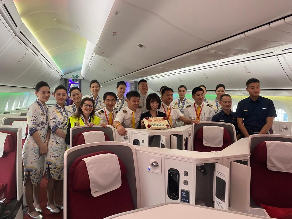 Nella prima immagine l’equipaggio posa nella business class del Boeing 787-9 Hainan Airlines.