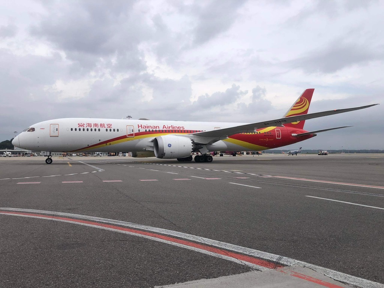 Non e’ il meteo piu’ consono a queste grandi occasioni, ma tant’e’ che vi mostriamo l’immagine del Boeing 787-9 Hainan Airlines appena arrivato a Milano Malpensa da Shenzhen.
