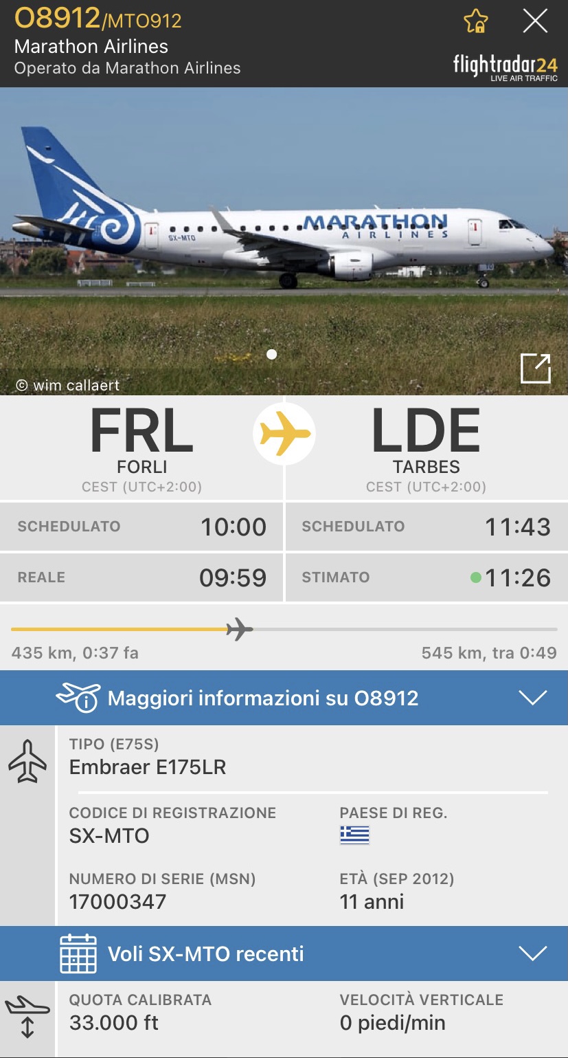 Oggi e’ partito da Forli un volo per Lourdes della aerolinea virtual romagnola Go To Fly, affidato a un E175 della compagnia aerea greca Marathon Airlines. Il velivolo ha una capacita’ di 88 posti. Il velivolo successivamente ritornera’ a Innsbruck in volo di riposizionamento, cosi come ha fatto stamani in arrivo a Forli.