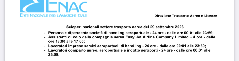 Come e’ noto nella giornata di domani ci saranno scioperi nel comparto del trasporto aereo relativi a chi lavora nell’ambito delle societa’ di handling anche perctutta la durata della giornata. Oltre a scioperi di una societa’ di catering e di easyJet per 4 ore.