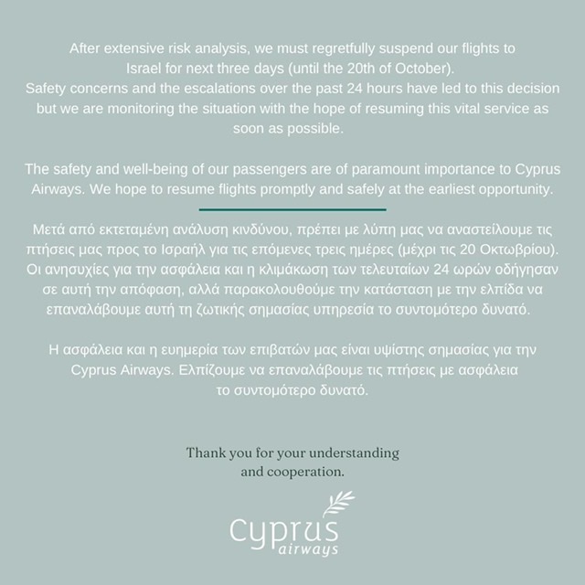 La compagnia aerea cipriota spera di riattivare i collegamenti alla prima occasione possibile sperando che sia il prima possibile. Cosi ha scritto nell’annuncio che alleghiamo e che ha pubblicato sui social.
