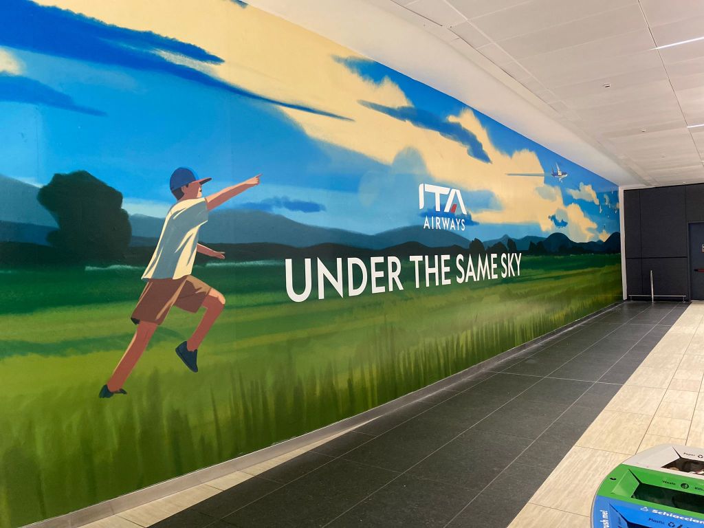 Il Manifesto di Sostenibilità di ITA Airways è presente sulle pareti esterne della «Hangar Lounge» della Compagnia al nuovo terminal A dell’Aeroporto Leonardo Da Vinci di Roma Fiumicino. L’opera dell’artista Emiliano Ponzi, traduce e racconta graficamente i 10 Sustainability Commitments di ITA Airways – allineati con gli obiettivi dell’Agenda ONU 2030 – e comunica il contributo che la Compagnia si impegna a dare nella costruzione di un mondo ambientalmente, socialmente ed economicamente sostenibile (the Same Planet, the Same People, the Same Commitment).