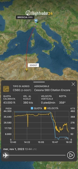Si legge che l’aereo giungeva a Brescia dall’Algeria. La toccata e’ avvenuta alle 17:28. In precedenza ha effettuato molte holding per una mezzoretta.