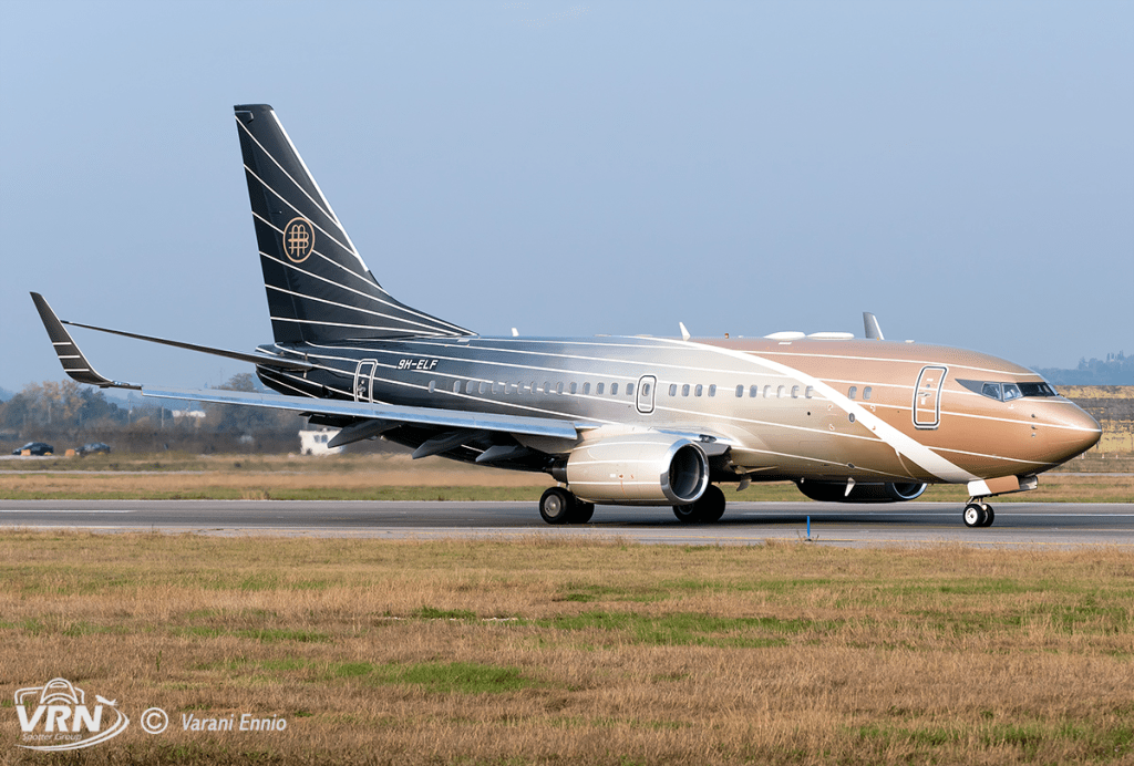 E’ un Boeing 737-7BC BBJ con marche 9H-ELF.