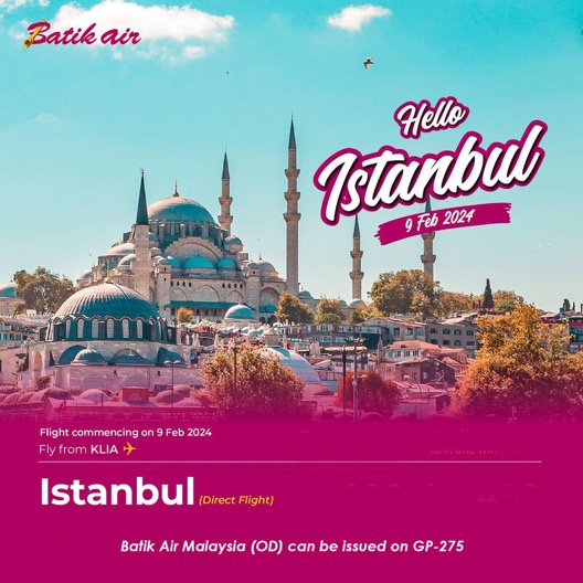 Nuova rotta per Batik Air Malaysia dal 9 febbraio 2024 e’ la Kuala Lumpur – Istanbul SAW.