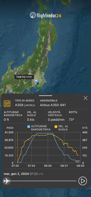 E’ una notizia dell’ultim’ora data da Aeronews circa il fatto che un A350-900 JAL – Japan Air Lines ha preso fuoco dopo aver compiuto l’atterraggio a Tokyo Haneda al termine del volo JL516 proveniente da Sapporo all’aeroporto della capitale giapponese.
