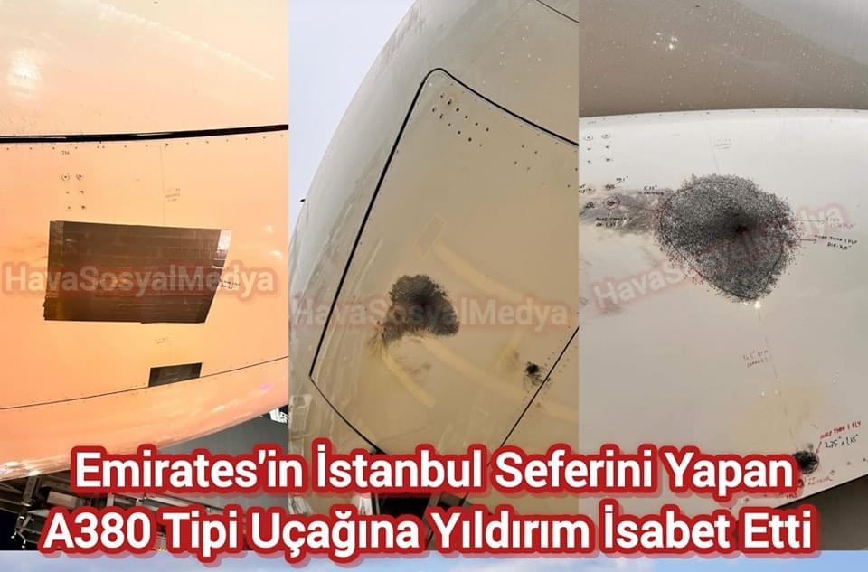 Nelle foto di Hava Sosyal Media viene rappresentato il danno occorso ieri ad un A380-800 Emirates che in avvicinamento un fulmine ha colpito una delle porte del carrello anteriore.